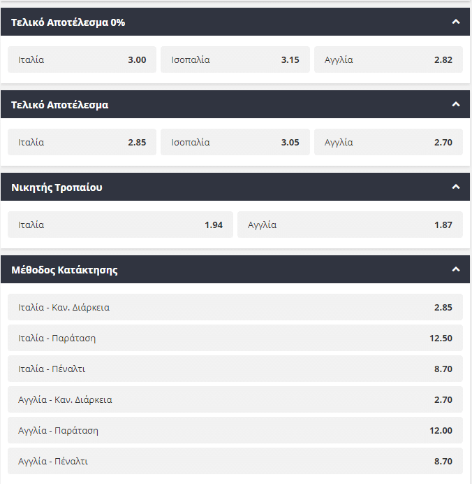 Στο στοιχηματικό κομμάτι, το σετ των αποδόσεων είναι μοιρασμένο, με την Ιταλία να πληρώνει στο 1,94 και την Αγγλία στο 1,87. Σαφώς πιο υψηλές αποδόσεις βρίσκουμε στο τελικό αποτέλεσμα του αγώνα, ενώ αν κάποιος επιλέξει ο μεγάλος τελικός να κριθεί στην διαδικασία των πέναλτι, είτε επιλέξει την Αγγλία είτε την Ιταλία θα λάβει απόδοση 8,70.