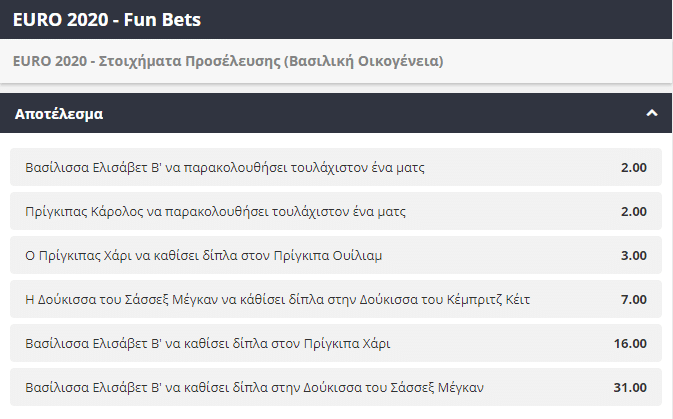 Στην πολύ πιθανή περίπτωση η Βασίλισσα Ελισάβετ Β’ παρακολουθήσει τουλάχιστον ένα ματς, πληρώνει με απόδοση 2.00, ενώ αν κάποιος επιλέξει τον πρίγκιπα Χάρι να καθίσει δίπλα στον πρίγκιπα Γουίλιαμ θα πληρωθεί με απόδοση 3.00. Το δύσκολο σενάριο να καθίσει η Βασίλισσα Ελισάβετ Β’ δίπλα-δίπλα με τη Δούκισσα τους Σάσσεξ Μέγκαν βρίσκεται σε απόδοση 31.00.