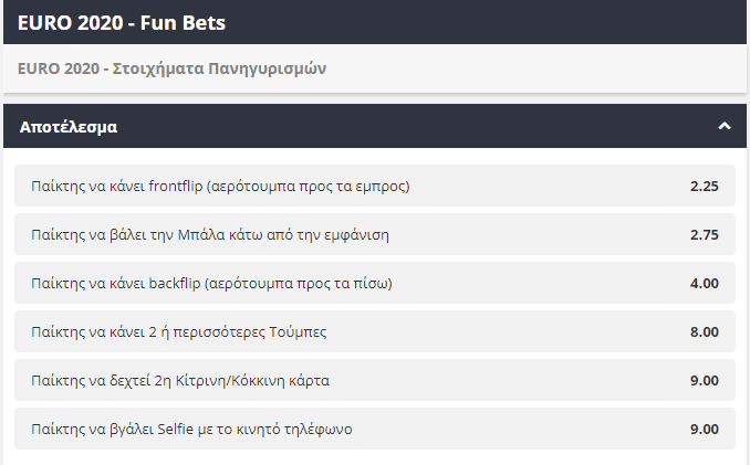 Σε περίπτωση που κάποιος παίκτης σκοράρει και κάνει δύο ή περισσότερες τούμπες, η απόδοση βρίσκεται στο 8.00. Τώρα εάν κάποιος θελήσει να βγάλει μία selfie με το κινητό του τηλέφωνο κατά τη διάρκεια του πανηγυρισμού θα πληρώσει σε απόδοση 9.00 όποιον τον επιλέξει.