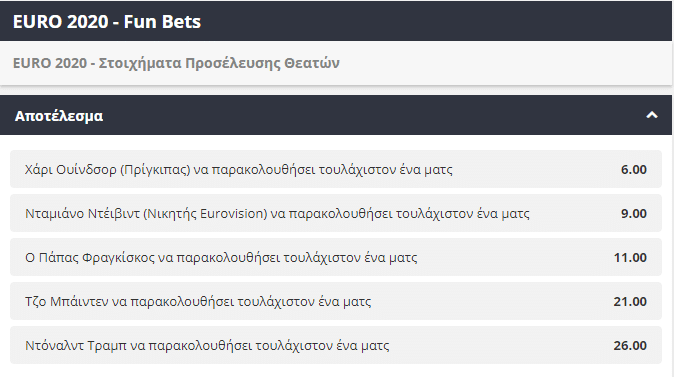 Ακόμα μία από τις κατηγορίες που ξεχωρίζουν όσον αφορά τις αγορές που προσφέρουν οι στοιχηματικές εταιρίες είναι αυτές για τα στοιχήματα προσέλευσης δημοφιλούς προσώπων. Εφόσον ο Πάπας Φραγκίσκος αποφασίζει να παρακολουθήσει τουλάχιστον ένα ματς, θα πληρώσει σε απόδοση 11:00 αυτόν που θα επιλέξει αυτήν την αγορά, ενώ στη μοναδική περίπτωση ο Ντόναλντ Τραμπ θα θελήσει να παρακολουθήσει τουλάχιστον ένα ματς η απόδοση εκτοξεύεται στο 26.00.