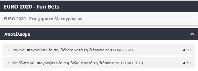 Πολλοί παίκτες κατά την διάρκεια του Ευρωπαϊκού Πρωταθλήματος θα προσπαθήσουν μέσω των εμφανίσεων τους να κερδίσουν ένα νέο συμβόλαιο, είτε στον σύλλογο τον οποίο αγωνίζονται, είτε κάπου αλλού. Στο συγκεκριμένο EURO, δύο είναι τα κορυφαία ονόματα τα οποία αναμένεται να τραβήξουν όλα τα βλέμματα πάνω τους, αφού είναι πολύ πιθανό με τις εμφανίσεις τους να κερδίσουν ένα νέο συμβόλαιο κατά την διάρκεια του euro. Αυτοί δεν είναι άλλοι από τους Χάρι Κέϊν και Κριστιάνο Ρονάλντο, που σε περίπτωση που αποφασίσουν να υπογράψουν ένα νέο συμβόλαιο κατά τη διάρκεια του τουρνουά θα πληρώσουν σε απόδοση 4.50 όποιον τους επιλέξει.