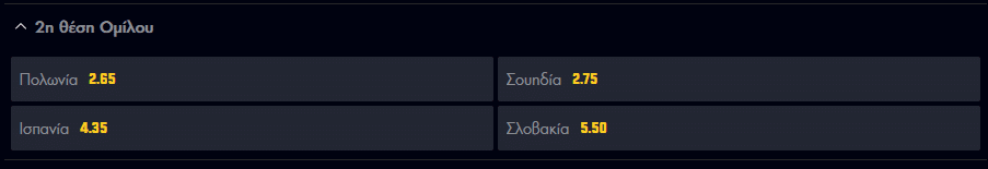 Ο 5ος όμιλος του EURO 2020, έχει ως ξεκάθαρο φαβορί την Ισπανία, αφού με αντιπάλους τις Πολωνία, Σουηδία και Σλοβακία, έχει τον πρώτο λόγο για την πρωτιά. Αυτό όμως που παραμένει μεγάλο ερωτηματικό είναι η 2η θέση του ομίλου, αφού οι υπόλοιπες τρεις ομάδες μοιράζονται τις πιθανότητες. Σε περίπτωση που η Σουηδία κατακτήσει την δεύτερη θέση του ομίλου, αυτή που θα την επιλέξουν θα λάβουν απόδοση 2,75. Αντίστοιχα η Πολωνία προσφέρεται στο 2,65, ενώ η Σλοβακία πενταπλάσιαζει τα χρήματα που θα ποντάρετε.