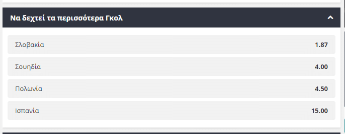 Με ενδιαφέρον όμως παρακολουθούμε και τις υπόλοιπες αγορές στον συγκεκριμένο όμιλο. Το ενδεχόμενο η Σλοβακία, που αποτελεί θεωρητικά το μεγάλο αουτσάιντερ του ομίλου, να δεχτεί τα περισσότερα γκολ δίνεται σε απόδοση 1,87, θα την επιλέξει θα λάβει απόδοση στο 4,50.