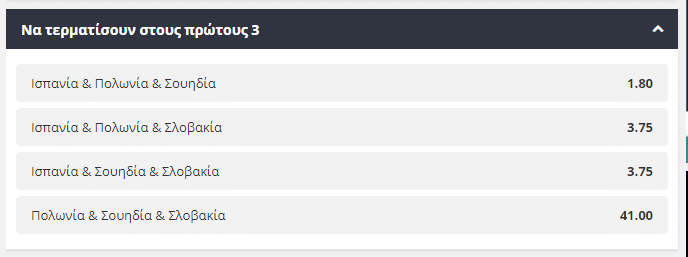 Ακόμα μία μακροχρόνια αγορά σε στοίχημα που αφορά τον 5ο όμιλο και μας κέντρισε το ενδιαφέρον είναι αυτή που αφορά το ποιες ομάδες θα καταφέρουν να τερματίσουν στις πρώτες τρεις θέσεις του ομίλου. Με την θεωρητικά αδύναμη Σλοβακία να έχει τις λιγότερες πιθανότητες, σε περίπτωση που η Ισπανία, Πολωνία και Σουηδία κατακτήσουν τις τρεις πρώτες θέσεις του ομίλου, αυτοί που θα τις επιλέξουν θα λάβουν απόδοση κοντά στο 1,80.