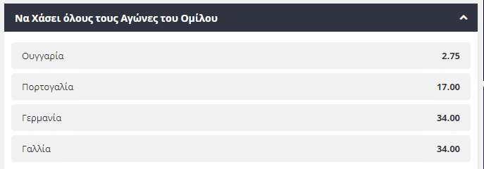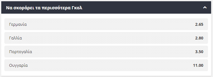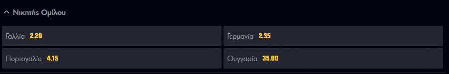 Όταν μιλάμε για τις Γαλλία, Γερμανία και Πορτογαλία είναι πολύ δύσκολη η επιλογή για το ποια θα κατακτήσει την πρώτη θέση στον όμιλο. Οι Γάλλοι αυτή τη στιγμή σύμφωνα με τις στοιχηματικές έχουν ένα ελαφρύ προβάδισμα αφού προσφέρονται στο 2,20, με την απόδοση της πλήρεστατης Πορτογαλίας να βρίσκεται στο 4,15.
