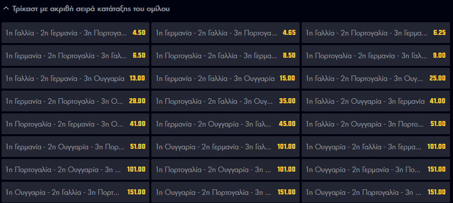 Αν κάποιος όμως θέλει να εκτοξεύσει την απόδοση και να πάρει λίγο μεγαλύτερο ρίσκο, τότε υπάρχει η αγορά τρίκαστ με ακριβή σειρά κατάταξης του ομίλου. Σε περίπτωση που τα πάντσερ καταφέρουν να πάρουν την πρώτη θέση του ομίλου, με τις Γαλλία και Πορτογαλία να ακολουθούν στην δεύτερη και τρίτη θέση αντίστοιχα, τότε οι παίκτες που θα επιλέξουν τη συγκεκριμένη αγορά θα λάβουν ως απόδοση το 4,65.