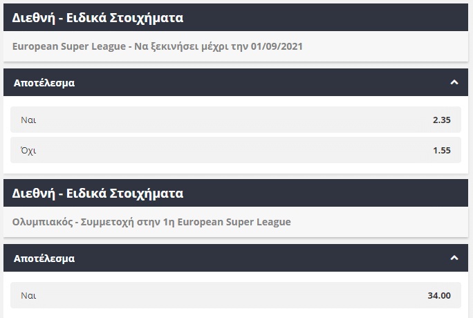 Μία εξαιρετική απόδοση θα λάβει όμως και όποιος επιλέξει ότι ο Ολυμπιακός θα βρίσκεται τελικά ανάμεσα στις ομάδες που θα συμμετέχουν στην European Super League. Συγκεκριμένα οι «ερυθρόλευκοι» βρίσκονται στην εξαιρετική απόδοση 34.00…