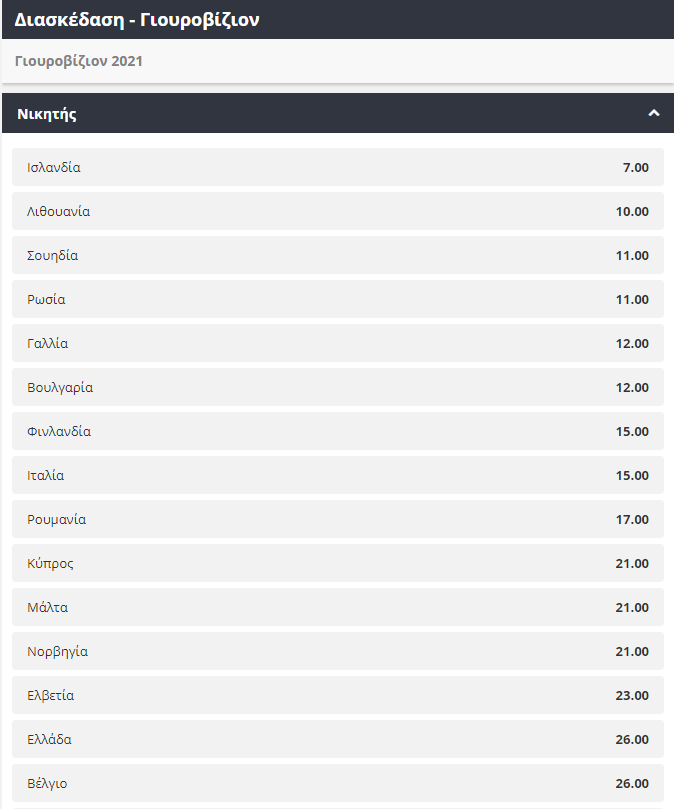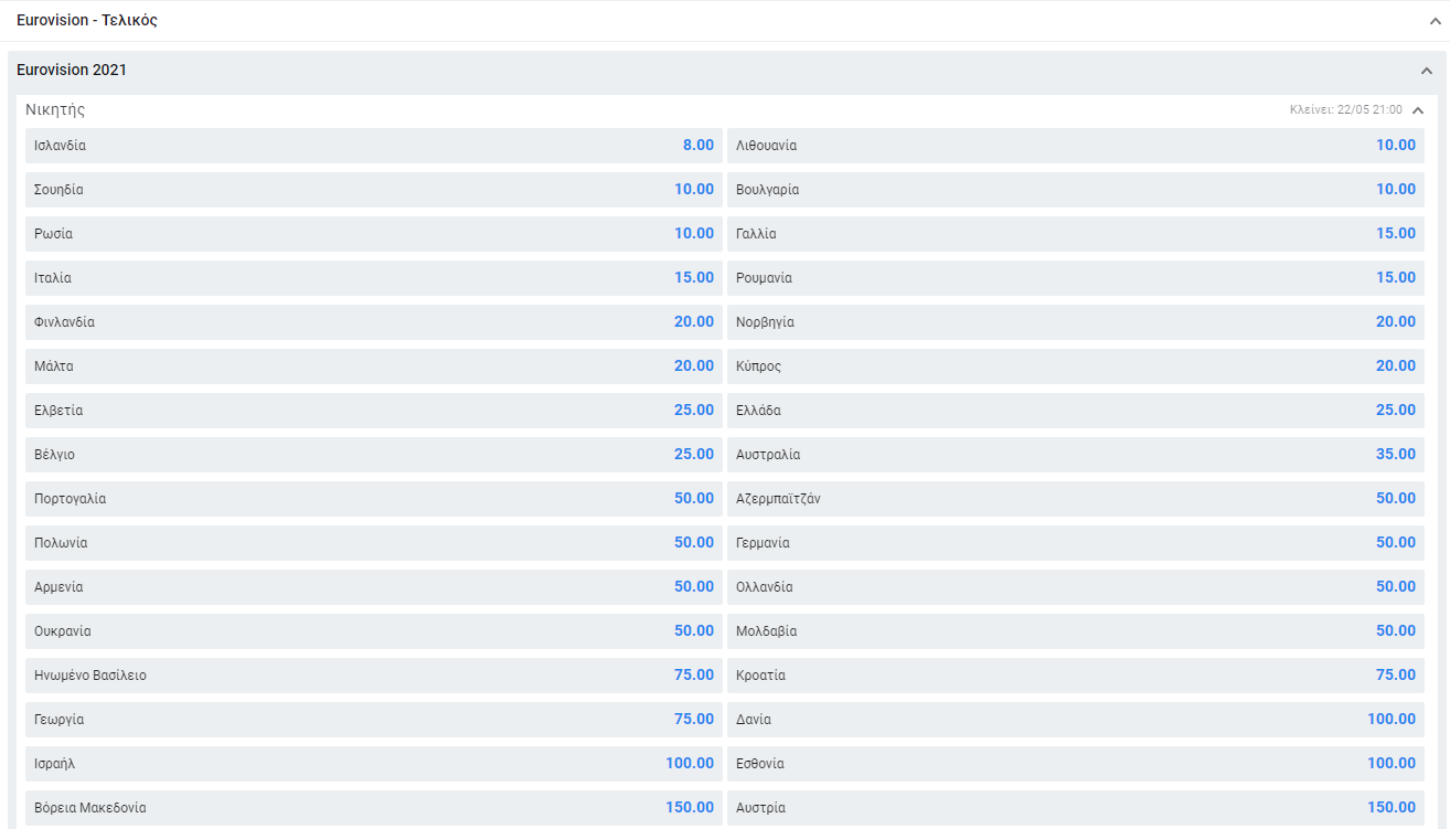 Η Eurovision 2021 κεντρίζει κάθε χρόνο ένα μεγάλο μέρος ανθρώπων και όπως κάθε χρόνο, έτσι και φέτος οι στοιχηματικές εταιρίες έχουν ήδη αρχίσει να δίνουν τις πρώτες αποδόσεις. Μικρές αλλά σημαντικές αλλαγές παρατηρούνται τις τελευταίες ώρες στις αποδόσεις των στοιχηματικών εταιρειών για τον νικητή του 65ου Διαγωνισμού Τραγουδιού της Eurovision.