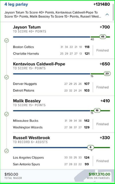 Jayson Tatum στο Μπόστον Σέλτικς – Σάρλοτ Χόρνετς και 40+ πόντους. Kentavious Caldwell-Pope στο Ντένβερ Νάγκετς – Ντιτρόιτ Πίστονς με 15+ πόντους. Malik Beasley στους 15+ στο Μιλγουόκι Μπακς – Γουάσινγκτον Γουίζαρντς. Και τέλος, τις 6+ ασίστ του Russell Westbrook στο Λος Άντζελες Κλίπερς – Σαν Αντόνιο Σπερς.