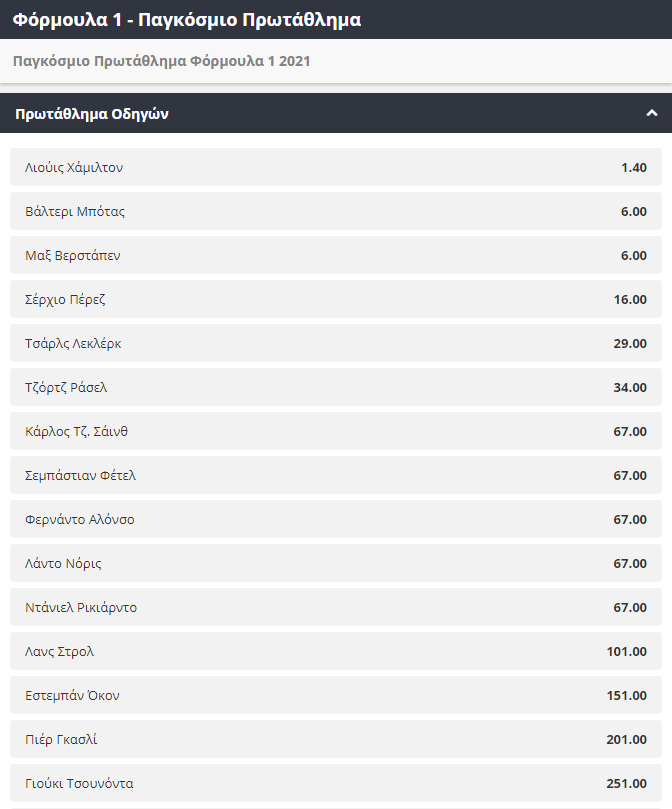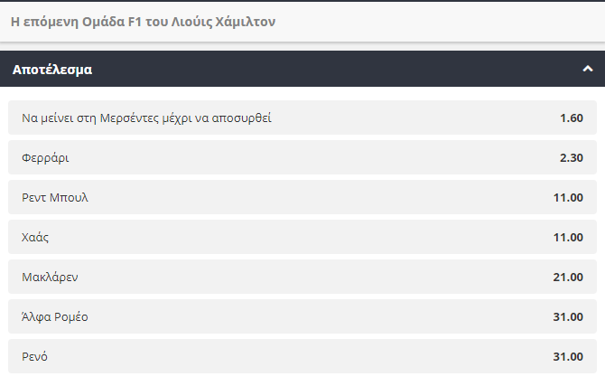 Το τελευταίο διάστημα υπάρχει μία φημολογία που ήθελε τον Λούϊς Χάμιλτον να θέλει να συνεχίσει την καριέρα του στην Mercedes(βρίσκεται εκεί για 14 συναπτά έτη, με τα τυπικά να απομένουν για την υπογραφή του νέου του συμβολαίου. Η Ferrari όμως περιμένει στην γωνία και είναι έτοιμη να προσφέρει πλουσιοπάροχο συμβόλαιο στον οδηγό, ύψους 50 εκ ευρώ το χρόνο. Οι μάνατζερ του Χάμιλτον ζητούσαν κλειστό τετραετές, συνολικού ύψους 200 εκατομμυρίων ευρώ, με την Mercedes να μην είναι διατεθειμένη να του το δώσει και πλέον όλα τα σενάρια είναι πιθανά. Δείτε αναλυτικά και τις αποδόσεις από τις στοιχηματικές: