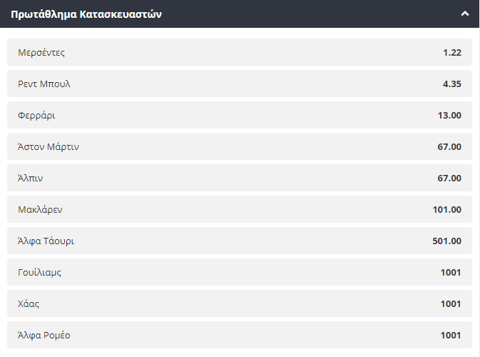 Όσον αφορά το πρωτάθλημα οδηγών και το πρωτάθλημα κατασκευαστών, οι πρώτες αποδόσεις έχουν ήδη κάνει την εμφάνισή τους στις στοιχηματικές και παρουσιάζουν τόσο τον Χάμιλτον, όσο και την Mercedes ως το απόλυτο φαβορί και πάλι. Οι Βάλτερι Μπότας και Μαξ Φερστάπεν ακολουθούν στην δεύτερη θέση με 6.00 απόδοση, ενώ για το πρωτάθλημα κατασκευαστών η Red Bull φαντάζει ως το δεύτερο φαβορί, με απόδοση 4.35.
