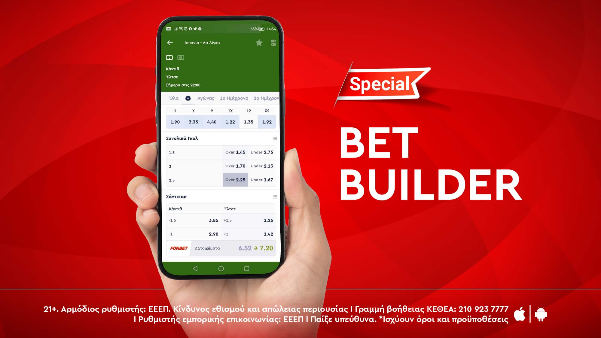 Τώρα, το παιχνίδι γίνεται ακόμη πιο διασκεδαστικό με το bet builder! Έχεις πλέον τη δυνατότητα να αυξήσεις ακόμα περισσότερο την απόδοση. Μπορείς να προσθέσεις διαθέσιμα στοιχήματα από τον ίδιο αγώνα, αλλά και οποιαδήποτε στοιχήματα από άλλον αγώνα στο ίδιο δελτίο στοιχήματος!