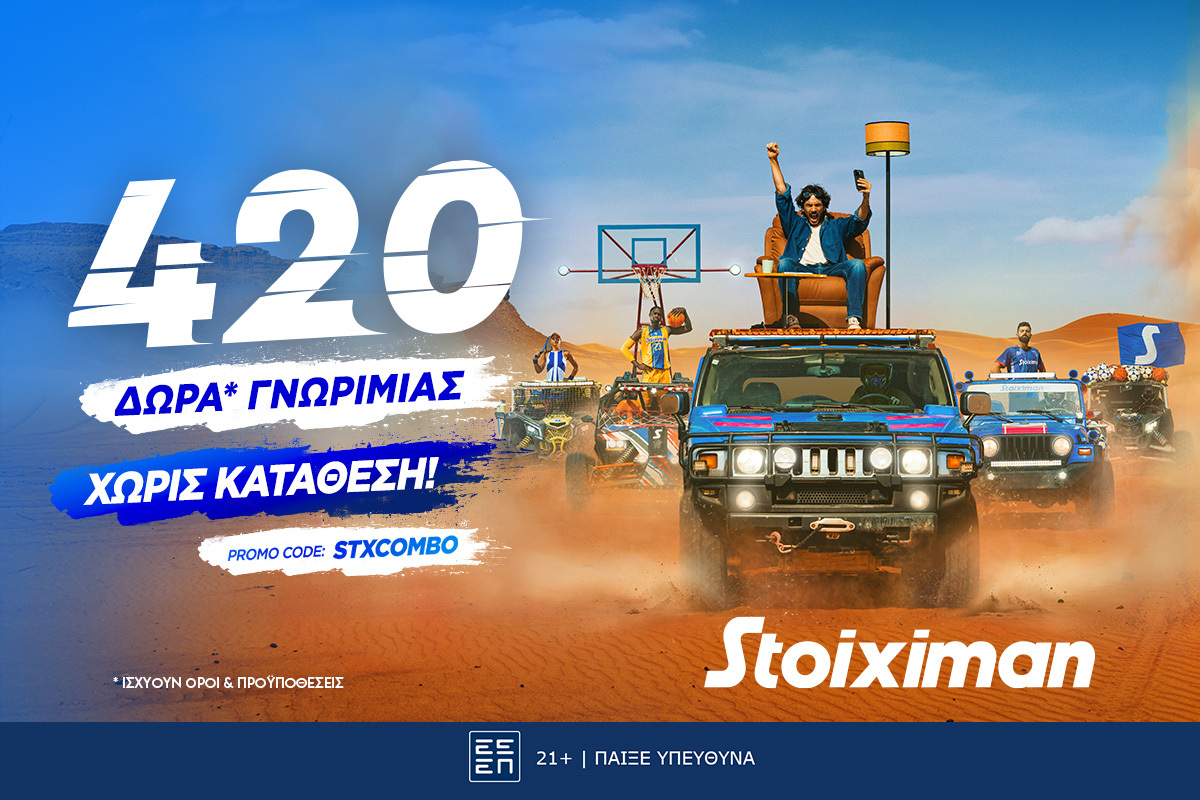 Το παιχνίδι ξεκινά από εσένα. Η στιγμή να το δεις στην πράξη είναι τώρα, αφού με την προσφορά γνωριμίας της Stoiximan, θα μπορείς μέχρι και τις 10 Νοεμβρίου να κάνεις δικά σου 420 δώρα, εντελώς δωρεάν* και χωρίς κατάθεση. Τα δώρα σου μοιράζονται ανάμεσα σε στοίχημα και Live Casino.