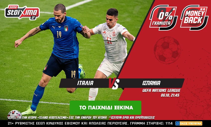 Όπως αναφέραμε, στο ποδοσφαιρικό πρόγραμμα της Τετάρτης 06/10 ξεχωρίζει ο μεγάλος ημιτελικός του Nations League ανάμεσα στην Ιταλία και την Ισπανία. Ποια από τις δύο ομάδες θα καταφέρει να φτάσει στον τελικό; Το Ιταλία – Ισπανία το ζεις παραπάνω στο Pamestoixima.gr, με 0% γκανιότα**, σούπερ ενισχυμένες αποδόσεις, πολλά ειδικά στοιχήματα και MoneyBack* στα πέναλτι! Ένα πακέτο που καλύπτει και τους πιο απαιτητικούς παίκτες και που θα το βρεις στο Pamestoixima.gr!