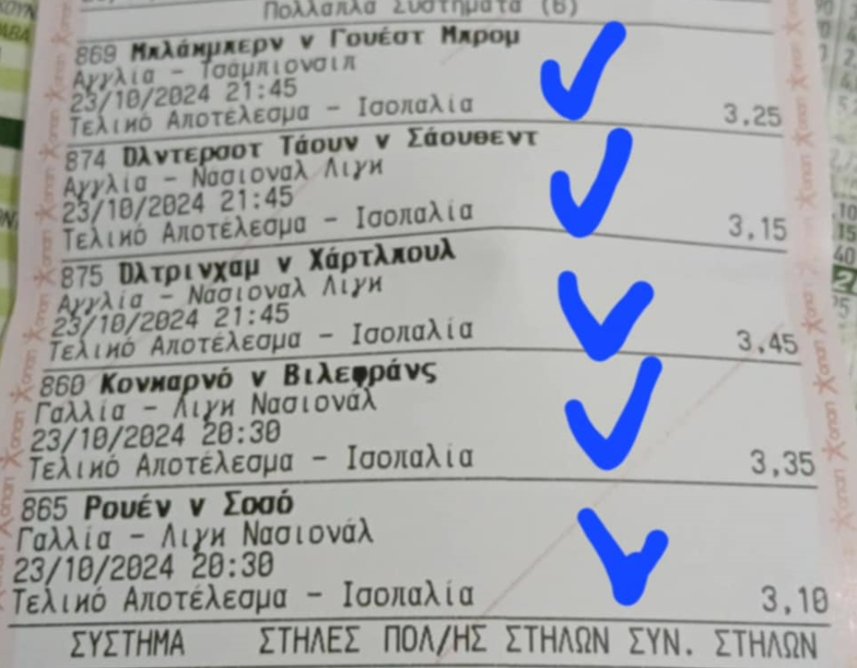 Μπλάκμπερν – Γουέστ Μπρομ από την Championship, Όλντερσοτ – Σαουθέντ και Όλτρινχαμ – Χάρτλπουλ από τη National και Κονκαρνό – Βιλεφράνς και Ρουέν – Σοσό από την τρίτη κατηγορία της Γαλλίας. Από 3.10 μέχρι 3.45 και συνολική απόδοση δελτίου στο 367! Κέρδη δεν μάθαμε, αλλά μάλλον τα πήρε χοντρά!