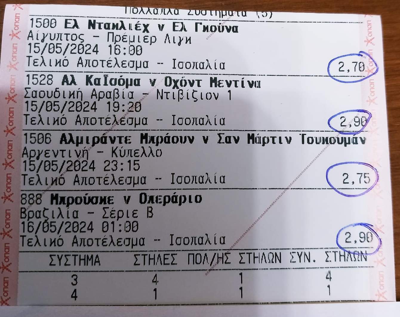 Αποδόσεις από 2.70 έως 2.90. Συνολικά, 62.44. Και το συστηματάκι του, το 3-4, δεν του χρησίμευσε κάπου!