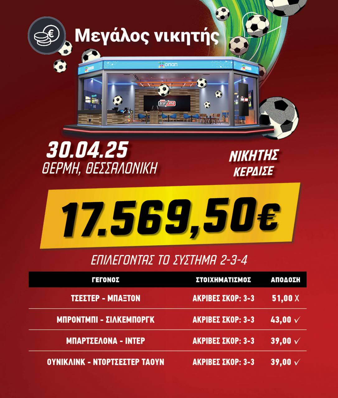 Μόνο έμπνευση! Όπως είχε αυτός εδώ ο τύπος από τη Θέρμη της Θεσσαλονίκης την τελευταία μέρα του Απρίλη! Έπαιξε, λοιπόν, ένα συστηματάκι 2-3-4 και έφτασε μια ανάσα από το να πιάσει απόδοση 3,3 εκατομμύρια! Ναι, δεν υπερβάλουμε, όπως ακριβώς το διαβάζετε! 3,3 εκατομμύρια!