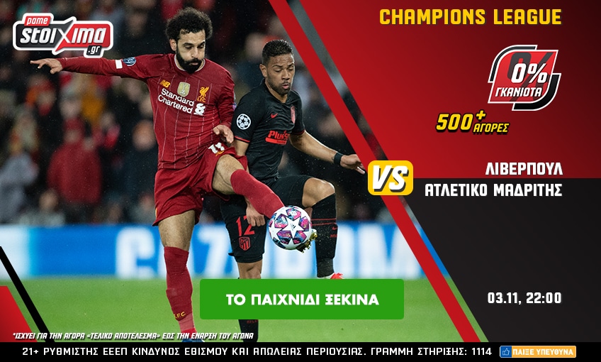 Στο πρόγραμμα της Τετάρτης (03/11), λοιπόν, ξεχωρίζουν τα παιχνίδια του Champions League και πιο συγκεκριμένα, την παράσταση κλέβει η σπουδαία «μάχη» ανάμεσα στη Λίβερπουλ και την Ατλέτικο Μαδρίτης! Ποια θα καταφέρει τελικά να φτάσει στο θετικό αποτέλεσμα; Στο ανανεωμένο Pamestoixima.gr το Λίβερπουλ – Ατλέτικο Μαδρίτης το ζεις με 0% γκανιότα**, αλλά και πολλά ειδικά στοιχήματα σε ΣΟΥΠΕΡ αποδόσεις!