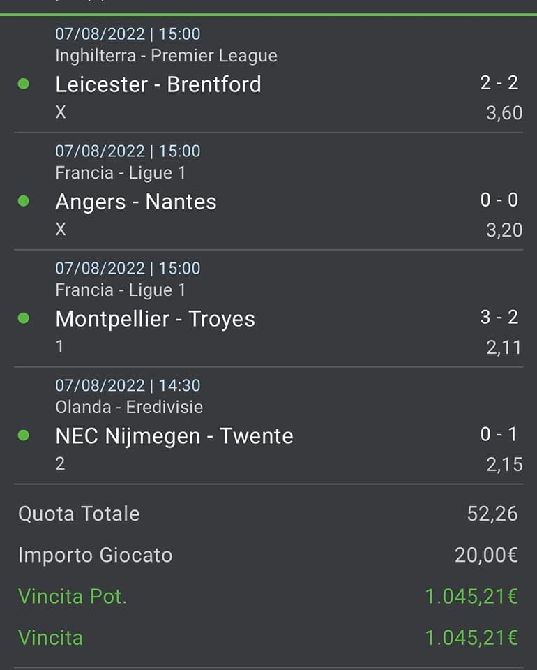 Λέστερ – Μπρέντφορντ στο Χ με 3.60, Ανζέ – Ναντ, επίσης στο Χ σε απόδοση 3.20, Μονπελιέ – Τρουά στον άσο του 2.11 και Ναϊμένγκεν – Τβέντε στο διπλό του 2.15. Συνολική απόδοση 52.26.