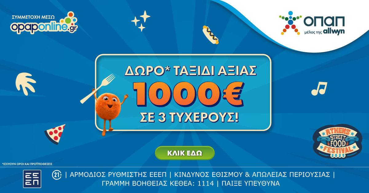 Μάλιστα, για όσους επιθυμούν να διευρύνουν τους γευστικούς τους ορίζοντες και…εκτός συνόρων, το opaponline.gr διοργανώνει μεγάλο ταξιδιωτικό διαγωνισμό*, με δωρεάν συμμετοχή για όλους τους νέους παίκτες. Συγκεκριμένα, στις 20 Μαΐου, θα προκύψουν, έπειτα από κλήρωση, 3 τυχεροί νικητές, που θα κερδίσουν από μία ταξιδιωτική δωροεπιταγή* αξίας 1.000 ευρώ.