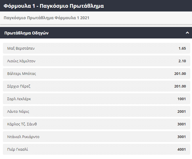 Στο πρωτάθλημα οδηγών, παρά το προβάδισμα του Λιούις Χάμιλτον στην βαθμολογία, ο Μαξ Φερστάπεν είναι το απόλυτο φαβορί για την κατάκτηση του πρωταθλήματος, την απόδοση του να κυμαίνεται κοντά στο 1,65. Λίγο ψηλότερα από τον διπλασιασμό βρίσκεται η απόδοση του Άγγλου πρωταθλητή, στο 2.10. Αξίζει να αναφέρουμε σε αυτό το σημείο ότι ο Χάμιλτον έχει κατακτήσει τον τίτλο του παγκόσμιου πρωταθλητή στο πρωτάθλημα οδηγών 7 φορές, το 2008, το 2014, το 2015, το 2017, το 2018, το 2019 και το 2020 ισοφαρίζοντας το ρεκόρ του Μίχαελ Σουμάχερ.