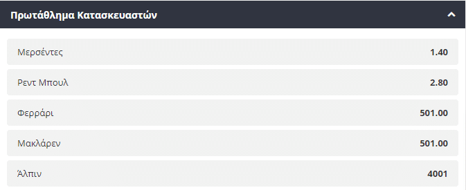 Όσον αφορά το πρωτάθλημα των κατασκευαστών η Mercedes έχει αρκετά μεγάλο προβάδισμα έναντι της Redbull και η απόδοση για την κατάκτηση του πρωταθλήματος βρίσκεται μόλις στο 1,40. Για τους λάτρεις των ανατροπών όμως το 280 στο οποίο προσφέρονται οι αυστριακοί είναι ελκυστικό