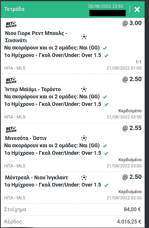 Ποια ήταν τα ματς; Νιου Γιορκ Ρεντ Μπουλς – Σινσινάτι, με το 1-1 του ημιχρόνου να πληρώνει κιόλας από το πρώτο 45λεπτο. Ίντερ Μαϊάμι – Τορόντο, όπου κι εδώ, ξεμπέρδεψε από το ημίχρονο. Μινεσότα – Όστιν με το 1-1 του ημιχρόνου να εξασφαλίζει κι εδώ τη νίκη. Τέλος, το Μόντρεαλ – Νιου Ίνγκλαντ ήταν το ματς που αρκέστηκε στο… απλό over 1,5 στο πρώτο μέρος, με το 2-0 να τον στέλνει στο ταμείο!