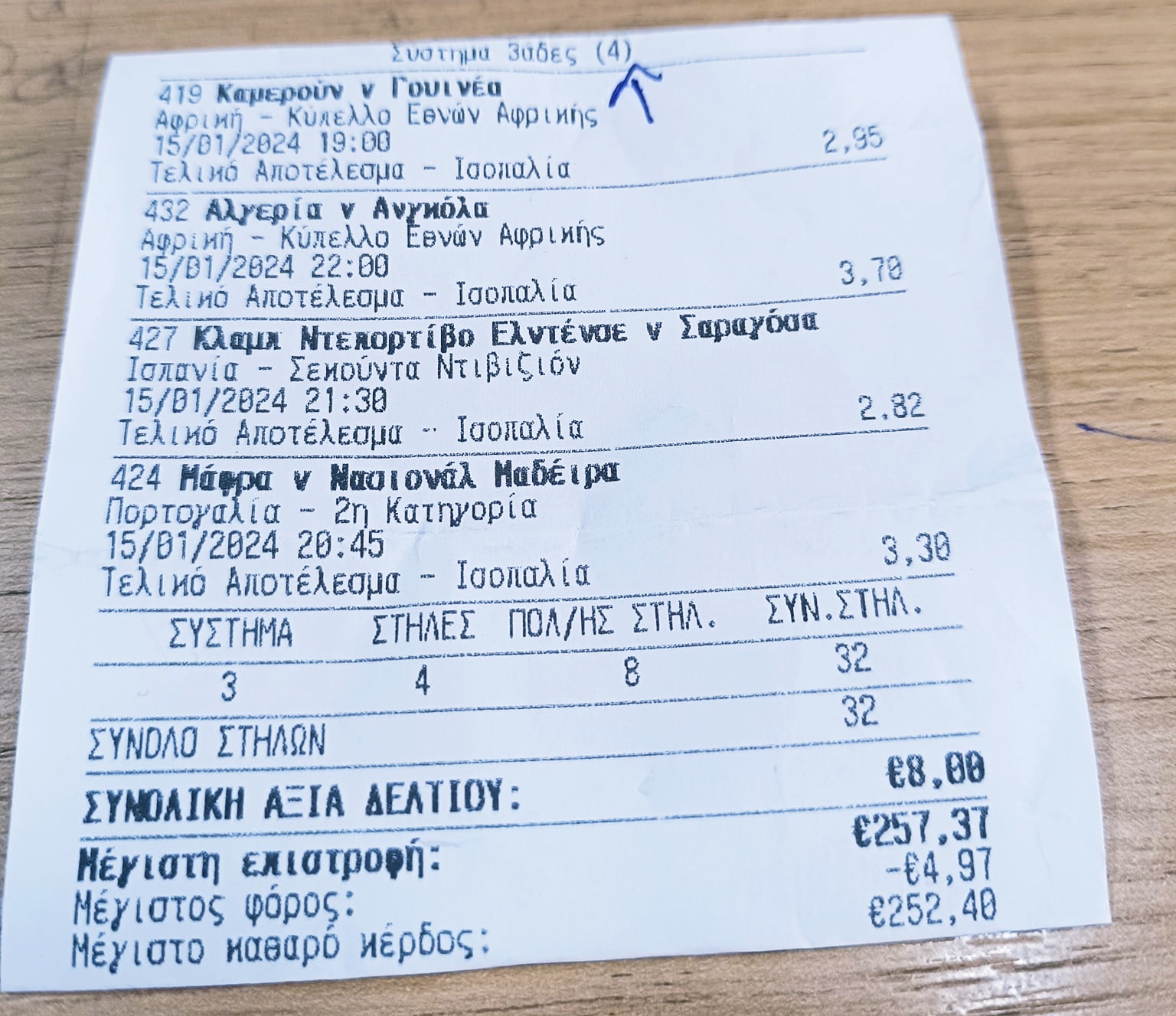 Του έδωσαν ένα 3ευρω και το έριξε σε καρέ χιναριών! Δύο από Κύπελλο Εθνών Αφρικής, ένα από Β’ Ισπανίας κι ένα από Β’ Πορτογαλίας! Όλα μέσα! 294 ευρώ τα κέρδη από αυτό το δελτίο!