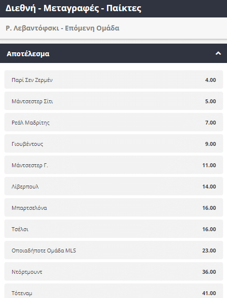 Εδώ μπορείτε να δείτε αναλυτικά τον πίνακα με τις ομάδες που ενδιαφέρονται για τον Λεβαντόφσκι και πως οι traders αξιολογούν τους πιθανούς προορισμούς με αποδόσεις: