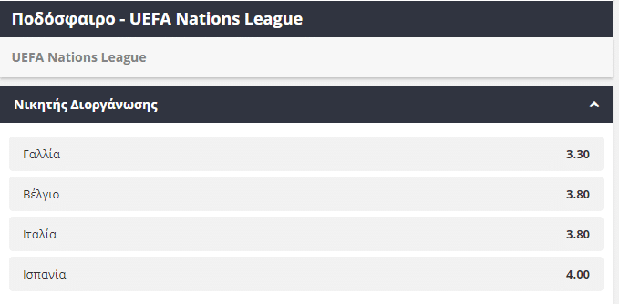 Φυσιολογικό στα μάτια των παικτών. Οι αποδόσεις για τον νικητή είναι αρκετά υψηλές, όπως άλλωστε και το ρίσκο της επιλογής. Το πρώτο φαβορί στην λίστα για την κατάκτηση του Νations League είναι η Γαλλία με απόδοση 3.30. Στην δεύτερη θέση ισοβαθμούν το Βέλγιο και Ιταλία, εννοώ όποιος επιλέξει την Ισπανία για την κατάκτηση της διοργάνωσης θα λάβει τέσσερις φορές τα λεφτά του πονταρίσματος του.