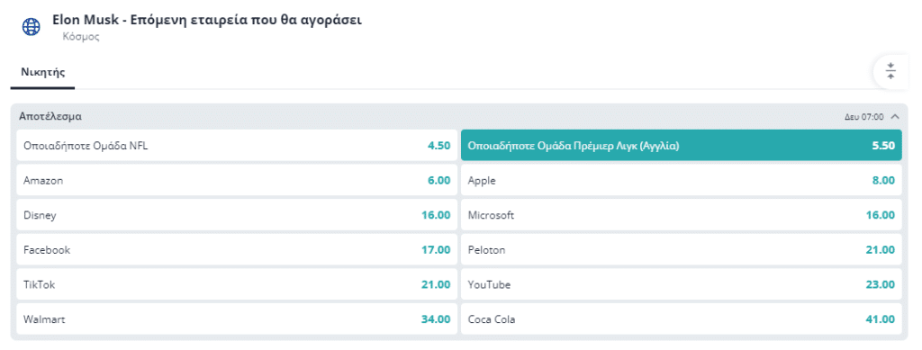 Από κοντά και η Amazon στο 6.00, ενώ παίζει και το ενδεχόμενο της Apple στο 8.00. Φυσικά, υπάρχουν κάθε λογής εταιρίες στη λίστα, όπως η Disney (16.00), η Microsoft (16.00), το Facebook (17.00), η Peloton (21.00), το Tik Tok (21.00), το Youtube (23.00), η Walmart (34.00) και η Coca Cola (41.00).