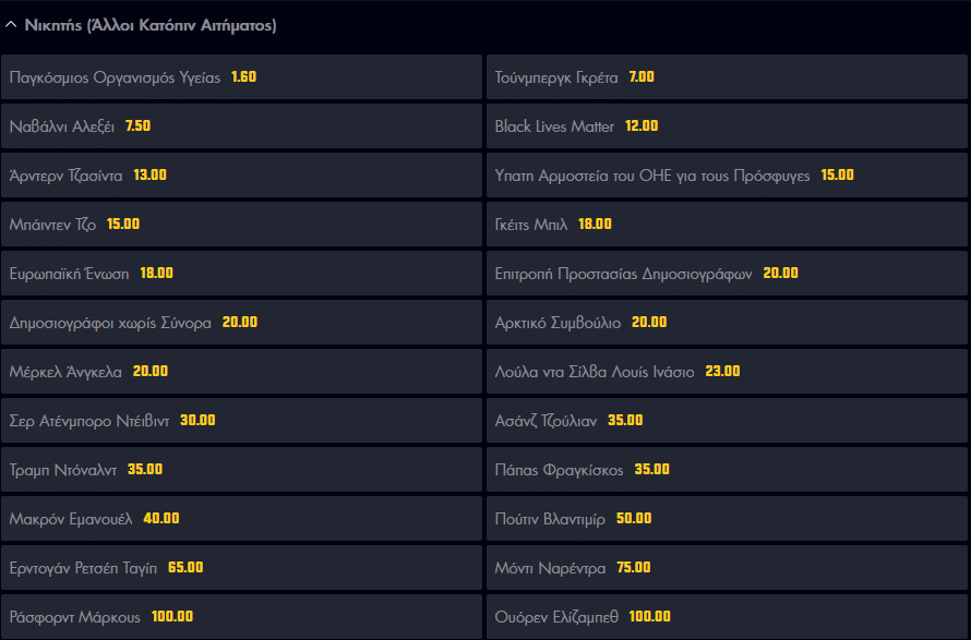 Από την σχετική λίστα δεν λείπει και το όνομα του Ντόναλντ Τραμπ, που πληρώνει με απόδοση 35.00, ενώ στην ίδια απόδοση βρίσκονται οι Πάπας Φραγκίσκος και Ασάντζ Τζούλιαν.