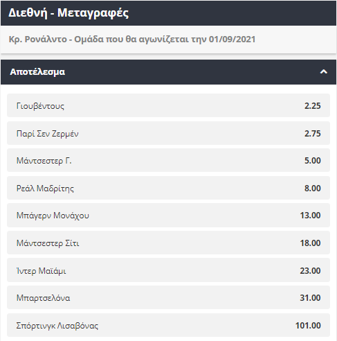 Ο Πορτογάλος σταρ άφησε την Μαδρίτη και την Ρεάλ Μαδρίτης για μία νέα πρόκληση στην καριέρα του, με την Γιουβέντους να καταφέρνει να αποσπάσει την υπογραφή του Κριστιάνο Ρονάλντο. Αυτό ανήκει στο παρελθόν, αφού πλέον ο Πορτογάλος επιθετικός είναι και ξανά έτοιμος να εξετάσει τις επιλογές του και να αποφασίσει την ιδανικότερη ομάδα για να συνεχίσει την καριέρα του. Το να παραμείνει στο Τορίνο και την Γιουβέντους, προσφέρεται σε απόδοση 2.25, ενώ πολύ κοντά βρίσκεται (σύμφωνα με τις φήμες) και η Παρί Σεν Ζερμέν, με απόδοση 2.75. Επόμενα φαβορί για τις στοιχηματικές είναι τόσο η Μάντσεστερ Γιουνάϊτεντ (5.00), όσο και η Ρεάλ Μαδρίτης (8.00), σε περίπτωση που ο Πορτογάλος αποφασίσει να κάνει το μεγάλο comeback.