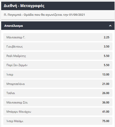 Το μέλλον του Πολ Πογκμπά στην Μάντσεστερ Γιουνάϊτεντ, μόνο σίγουρο δεν θεωρείται το τελευταίο διάστημα, αφού τόσο οι διοικούντες της ομάδας, όσο και ο ίδιος δείχνουν να επιθυμούν να συνεχίσουν σε διαφορετικό δρόμο. Παρ’ όλα αυτά, σύμφωνα με τις στοιχηματικές, οι «κόκκινοι διάβολοι» παραμένουν το μεγάλο φαβορί για να κρατήσουν τον Ιταλό σταρ στο ρόστερ τους, σε μία απόδοση που προσφέρεται στο 2.25. Η πιθανή επιστροφή του Πογκμπά στο Τορίνο και την Γιουβέντους έρχεται δεύτερη σε απόδοση 3.50, ενώ Ρεάλ Μαδρίτης και Παρί Σεν Ζερμέν, που αναμένεται να χαλάσουν αρκετά χρήματα στο μεταγραφικό παζάρι, μοιράζονται την ίδια απόδοση(5.50).