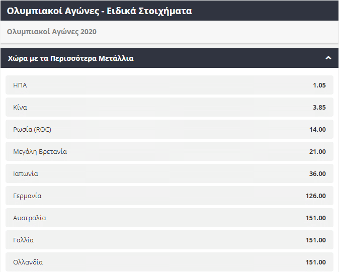 Από την πλευρά τους οι στοιχηματικές εταιρίες έχουν ήδη αρχίσει να προσφέρουν τις πρώτες αποδόσεις για τους μεγάλους νικητές, αλλά και για τις χώρες τις οποίες εκπροσωπούν. Παραδοσιακά οι Ηνωμένες Πολιτείες Αμερικής ξεχωρίζουν στο συγκεκριμένο κομμάτι, αφού διαθέτουν κορυφαίους αθλητές στα περισσότερα από τα προσφερόμενα αθλήματα και ως εκ τούτου προσφέρονται μόλις στο 1,05 για να είναι η χώρα που θα κατακτήσει τα περισσότερα μετάλλια. Στο 3,85 μπορεί να βρει κάποιος την Κίνα, ενώ με 21.00 απόδοση θα πληρωθεί αυτός που θα επιλέξει την Μεγάλη Βρετανία, σε περίπτωση που οι Άγγλοι κατακτήσουν τα περισσότερα μετάλλια.