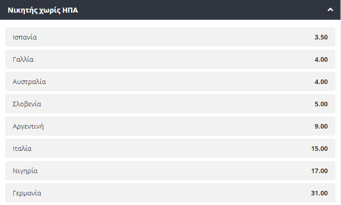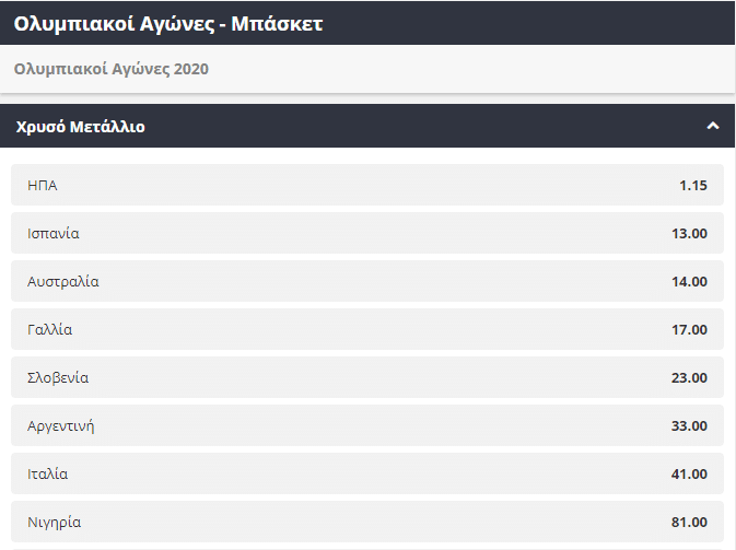 Μία κατηγορία που αναμένεται να τραβήξει αρκετά το ενδιαφέρον του κόσμου είναι και πάλι στο μπάσκετ. Αν αφαιρέσουμε τις ΗΠΑ από την σχετική λίστα, ως πρώτο φαβορί σε αυτήν την περίπτωση παρουσιάζονται οι Ισπανοί(3.50), ενώ Γάλλοι και Αυστραλοί μοιράζονται τη δεύτερη θέση (4.00).