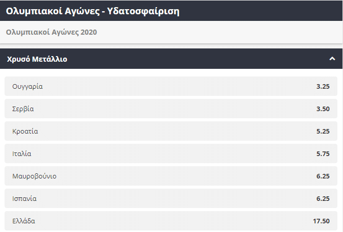 Με καλές πιθανότητες για την κατάκτηση ενός μεταλλίου κατεβαίνει το ομοσπονδιακό μας συγκρότημα στην υδατοσφαίριση(Πόλο). Παραδοσιακά οι Έλληνες παρουσιάζουν ανταγωνιστική ομάδα στο συγκεκριμένο άθλημα, ενώ δεν είναι λίγες οι φορές που έχουμε καταφέρει να κοιτάξουμε στα μάτια ομάδες με μεγάλη ιστορία. Ως πρώτο φαβορί για την κατάκτηση του χρυσού μεταλλίου προσφέρονται οι Ούγγροι(3.25), ενώ λίγο πιο κάτω βρίσκονται οι Σέρβοι (3.50). Σε περίπτωση που κάποιος επιλέξει την Εθνική Ελλάδος να κατακτήσει το χρυσό μετάλλιο στην υδατοσφαίριση στους Ολυμπιακούς Αγώνες του Τόκιο, θα λάβει την εξαιρετική απόδοση του 17,50.
