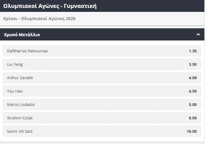 Ακόμα μία κατηγορία που τραβάει τα βλέμματα του ελληνικού κοινού στους Ολυμπιακούς Αγώνες είναι αυτή της γυμναστικής. Ειδικά στην κατηγορία των κρίκων, η παρουσία του Λευτέρη Πετρούνια δίνει ακόμα έναν λόγο σε πολλούς Έλληνες να παρακολουθήσουν και να στηρίξουν τον Έλληνα πρωταθλητή. Όπως είναι απόλυτα φυσιολογικό ο Λευτέρης Πετρούνιας προσφέρεται ως το απόλυτο φαβορί για την κατάκτηση του χρυσού μεταλλίου, με την απόδοσή του να βρίσκεται μόλις στο 1,35.