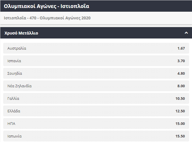 Σίγουρα ακόμα μία κατηγορία που θα απασχολήσει το ελληνικό κοινό λόγω της καλής παρουσίας των Ελλήνων πρωταθλητών, είναι αυτή της ιστιοπλοΐας. Στην κατηγορία 470 η Ελλάδα βρίσκεται μέσα στις υποψήφιες για την κατάκτηση του χρυσού μεταλλίου, με την απόδοσή της να βρίσκεται στο 12.50. Η εξαιρετική ομάδα της Αυστραλίας όμως προβάρει ως το απόλυτο φαβορί για την κατάκτηση του χρυσού μεταλλίου με την απόδοση της να βρίσκεται στο 1,67.