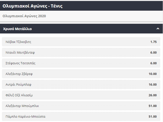 Το τένις έχει μπει για τα καλά στη ζωή μας τα τελευταία χρόνια αφού η εξαιρετική παρουσία του Στέφανου Τσιτσιπά και της Μαρίας Σάκκαρη στα μεγαλύτερα τουρνουά παγκοσμίως, έχουν και έχουν γεννήσει καινούργιους φαν του αθλήματος. Από το παλμαρέ του Στέφανου Τσιτσιπά σίγουρα λείπει ένα Ολυμπιακό μετάλλιο και ίσως Ολυμπιακούς Αγώνες του Τόκιο να έχει την ευκαιρία να το κατακτήσει. Στην περίπτωση που κάποιος επιλέξει τον Έλληνα πρωταθλητή για να κατακτήσει το χρυσό μετάλλιο θα λάβει απόδοση 6.00, με το Νόβακ Τζόκοβιτς να παρουσιάζεται ως το απόλυτο φαβορί με την απόδοσή του να βρίσκεται στο 1.75.