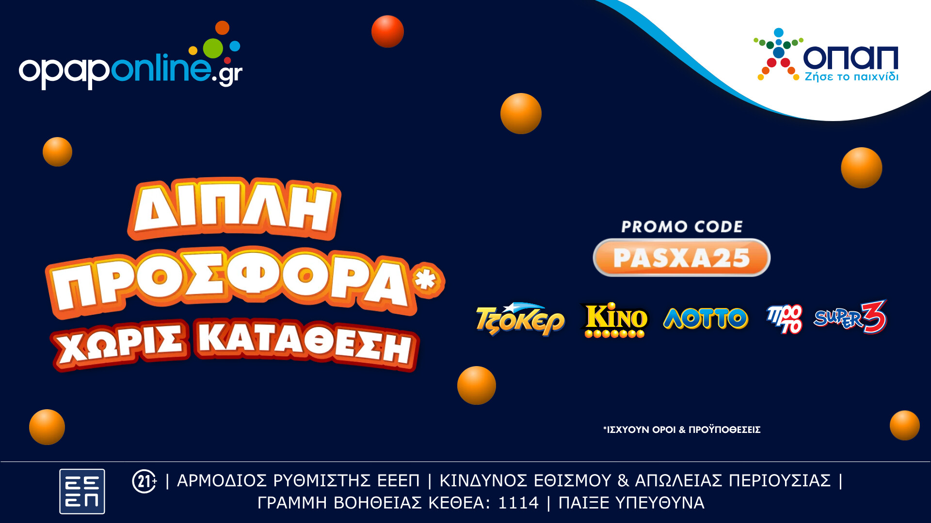 Για λίγες ημέρες, οι νέοι χρήστες του opaponline.gr μπορούν να βρουν διαθέσιμη μια σούπερ διπλή, πασχαλινή προσφορά* δωρεάν, χωρίς κατάθεση, χρησιμοποιώντας τον κωδικό PASXA25.