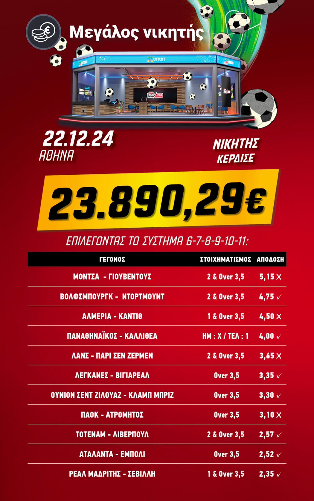 Έπιασε το combo της Ντόρτμουντ στη Βόλφσμπουργκ, έπιασε το ημίχρονο-τελικό του Παναθηναϊκού κόντρα στην Athens Kallithea, έπιασε τα γκολ σε Λεγκανές – Βιγιαρεάλ, Ουνιόν Σεντ Ζιλουάζ – Κλαμπ Μπριζ και Αταλάντα – Έμπολι, έπιασε και το combo της Λίβερπουλ στο Λονδίνο απέναντι στην Τότεναμ. Επτά στη σούμα.