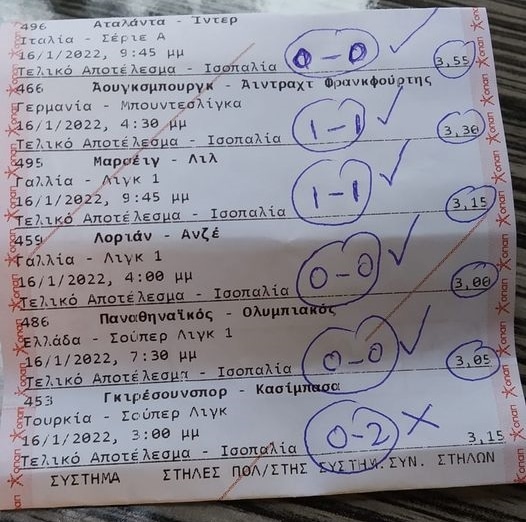 Σίγουρα το πρώτο χαμένο ματς, πάντα ρίχνει την αυτοπεποίθησή κάθε παίκτη, αλλά στη συγκεκριμένη περίπτωση αφού το ποντάρισμα ήταν σε σύστημα 3-4-5-6, τα πάντα ήταν ανοιχτά για τη συνέχεια! Από τα μεσημεριανά ματς ο μεγάλος νικητής επέλεξε την ισοπαλία στην αναμέτρηση από το γαλλικό πρωτάθλημα ανάμεσα στην Λοριάν και την Ανζέρ, ενώ ίδιο αποτέλεσμα ήθελε και στην αναμέτρηση της Άουγκσμπουργκ με την Άιντραχτ Φρανκφούρτης από την Βundesliga! Το 0-0 στην Γαλλία και το 1-1 στην Γερμανία , έδωσαν τη δυνατότητα στον παίκτη να κυκλώσει τα δύο πρώτα σημεία του.