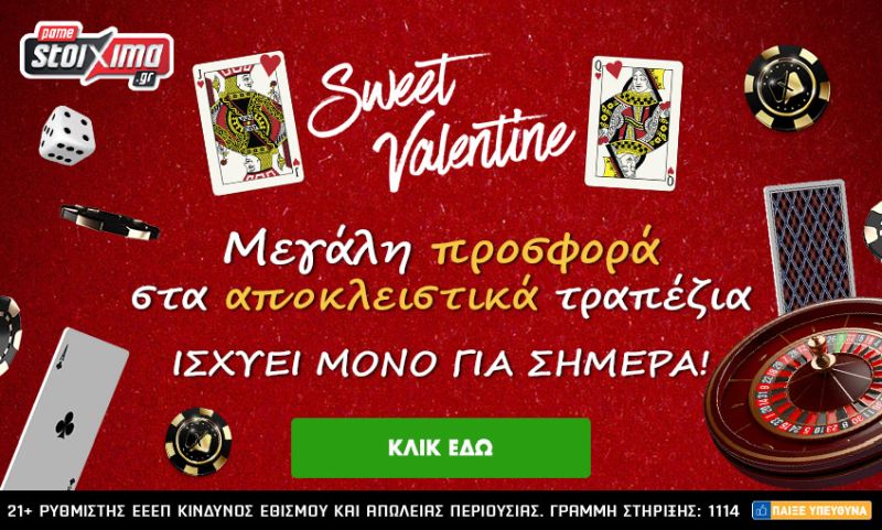 Έτσι λοιπόν, μόνο για σήμερα Πέμπτη (10/02) σας περιμένει μια μοναδική και εκπληκτική προσφορά* στα αποκλειστικά live tables του Pamestoixima.gr. Εσείς απλά καλείστε να παίξετε στα αγαπημένο σας παιχνίδια και η παικτική σας δραστηριότητα θα σας φέρει μια μοναδική επιβράβευση*. Η εβδομάδα είναι… Sweet Valentine στο Pamestoixima.gr!
