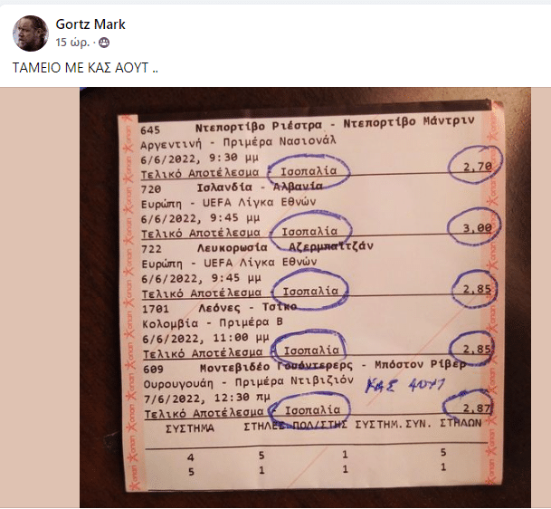 Ο παικταράς αυτός, είχε την έμπνευση να ρίξει ένα δελτίο πέντε ισοπαλιών, με ματς από Αργεντινή, Κολομβία και Ουρουγουάη μέχρι Nations League! Οι αποδόσεις; Όλες κάπου ανάμεσα στο 2.70 και το 3.00.