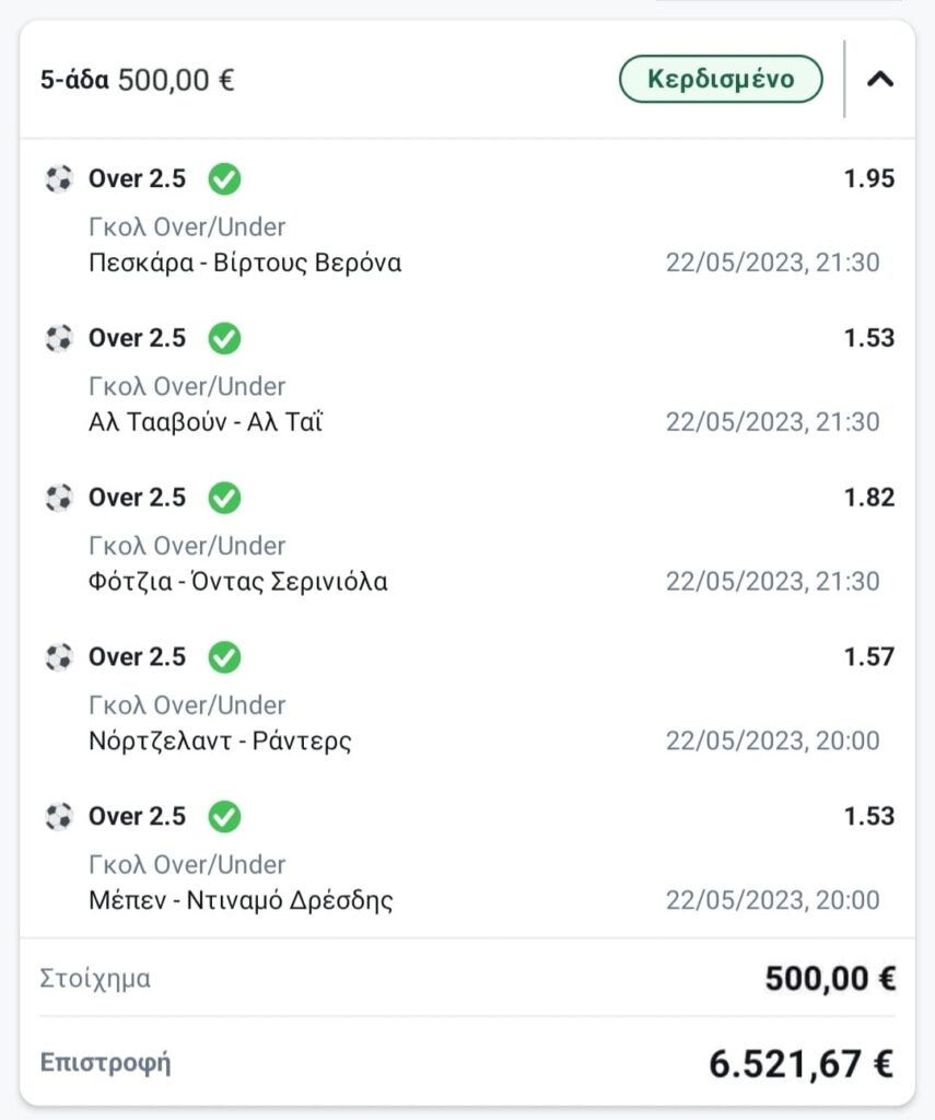 Πεντάδα με Over 2,5 και 500 ευρώ ποντάρισμα! Δείτε πόσα σήκωσε!