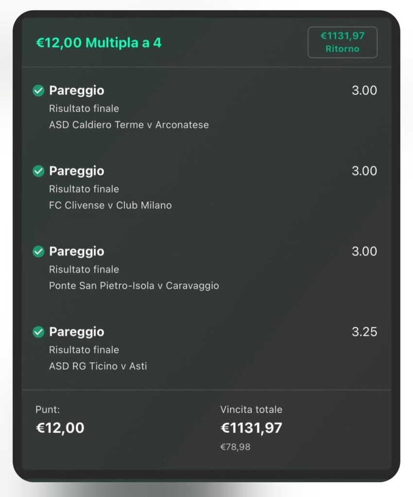 Ο Ιταλός μας όμως, είναι μετρ του πρωταθλήματος και το απέδειξε! Τέσσερα ματσάκια από την τέταρτη κατηγορία της γείτονος, όλα στο Χ, όλα πιασμένα! Αλλού με 104 απόδοση, αλλού με 88, ανάλογα την εταιρία!