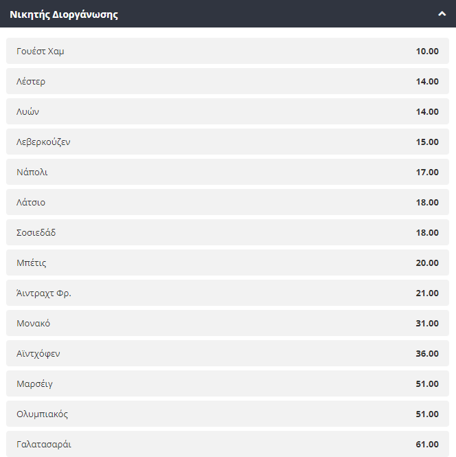Ήδη λοιπόν οι εταιρείες έχουν αρχίσει και ξεχωρίζουν τα φαβορί, με τις Λέστερ και Λυών να βρίσκονται στην κορυφή της σχετικής λίστας, με την απόδοση την οποία προσφέρονται να βρίσκεται στο 14.00. Οι “αλεπούδες” αγωνίζονται σε ένα άκρως ανταγωνιστικό πρωτάθλημα και έχουν θέση τον πήχη αρκετά ψηλά την φετινή σεζόν. Ακόμα μία βασική υποψήφια είναι η Νάπολι, η ποία έχει ξεκινήσει εκπληκτικά τη σεζόν και το ρόστερ της αποτελείται από ποιοτικούς ποδοσφαιριστές με πολλές λύσεις σε κάθε γραμμή. Η απόδοση κατάκτησης στο 17.00 φαίνεται αρκετά… θελκτική προς το κοινό.