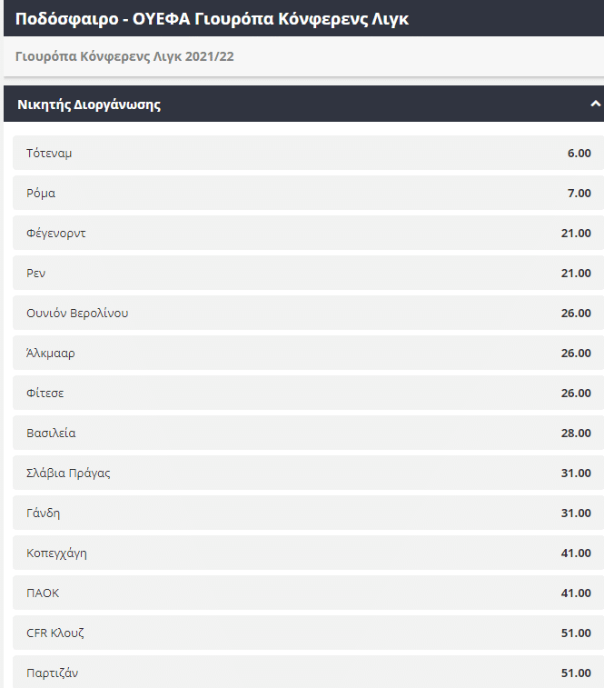 Η λίστα με τις αποδόσεις για τους πιθανούς νικητές του Europa Conference League βρίσκεται εδώ: