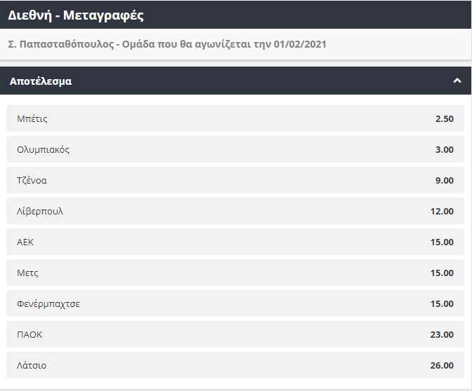 Στο παιχνίδι της απόκτησής του έχει μπει το τελευταίο διάστημα τόσο η Λάτσιο, όσο και η Φενέρμπαχτσέ, με τους Ιταλούς να πληρώνουν σε εξαιρετική απόδοση, αφού στο ενδεχόμενο που κάποιος αποφασίσει να ποντάρει στους «λατσιάλι» θα λάβει απόδοση 26.00!